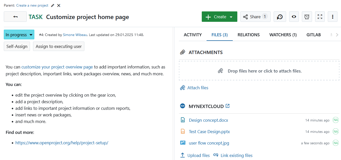 Create and link work packages directly in Nextcloud. Whether you’re browsing through project files or brainstorming in shared folders, you can instantly connect tasks to your project management system without interrupting your workflow.