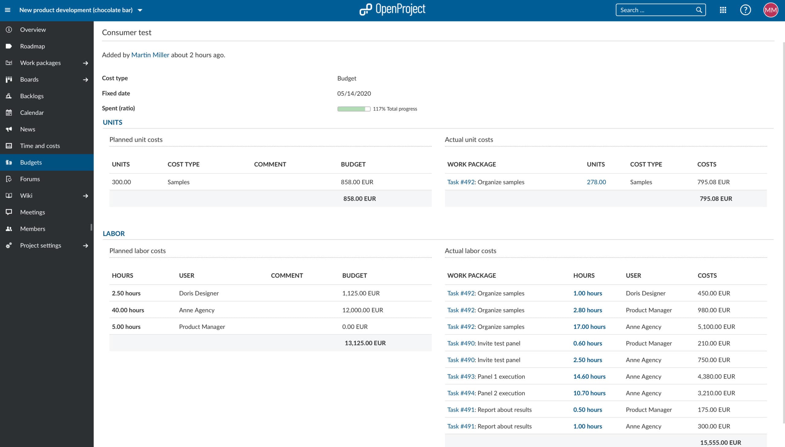 OpenProject will make the budgeting process very easy and transparent for you. Plan labor and unit costs individually whereby you can also customize your unit costs. Define your budget for the whole project or break your project budget down into sub-budgets. Below you find an example of the project budget for “New product development (chocolate bar)” that is split into four sub-budgets.