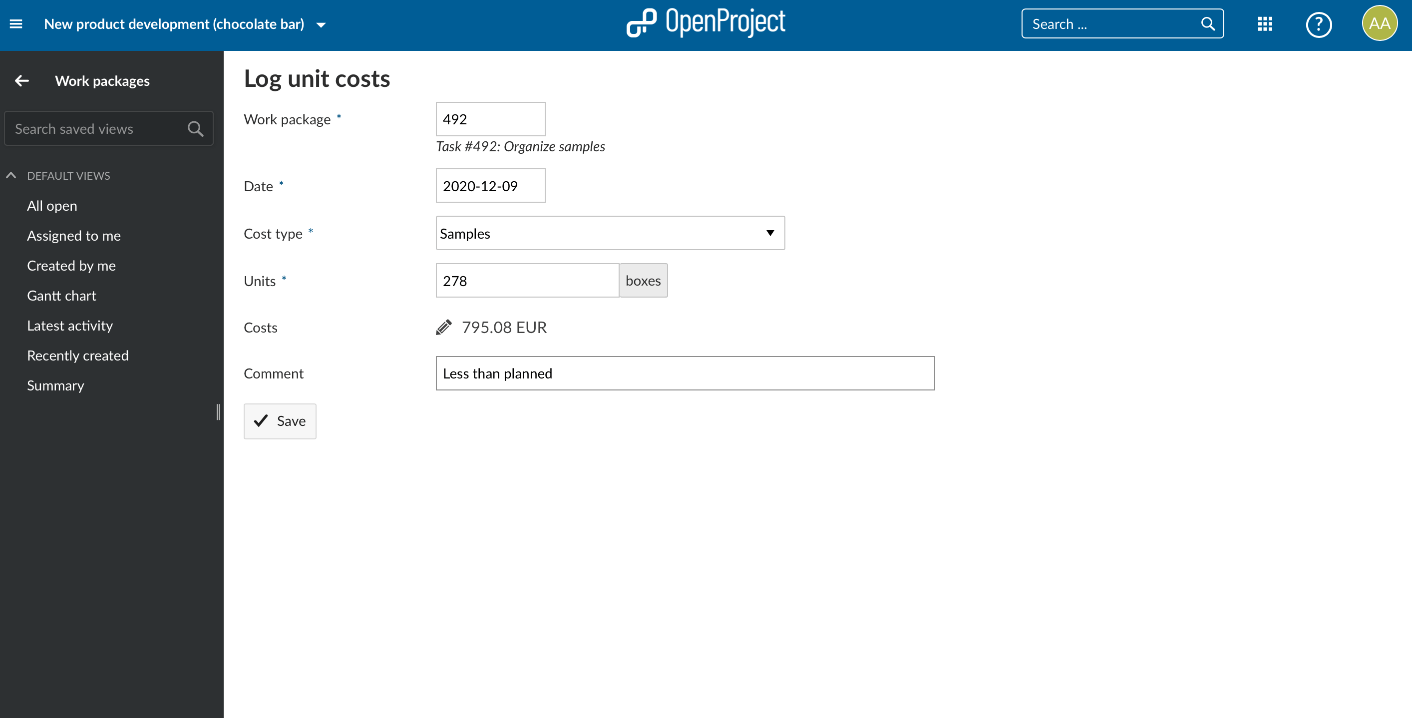 Capturing unit costs is also done on work package level. After having defined cost types for your project and accordingly their prices, the team members can choose from a drop down. Unit costs will be calculated automatically and allocated to the relevant work package.