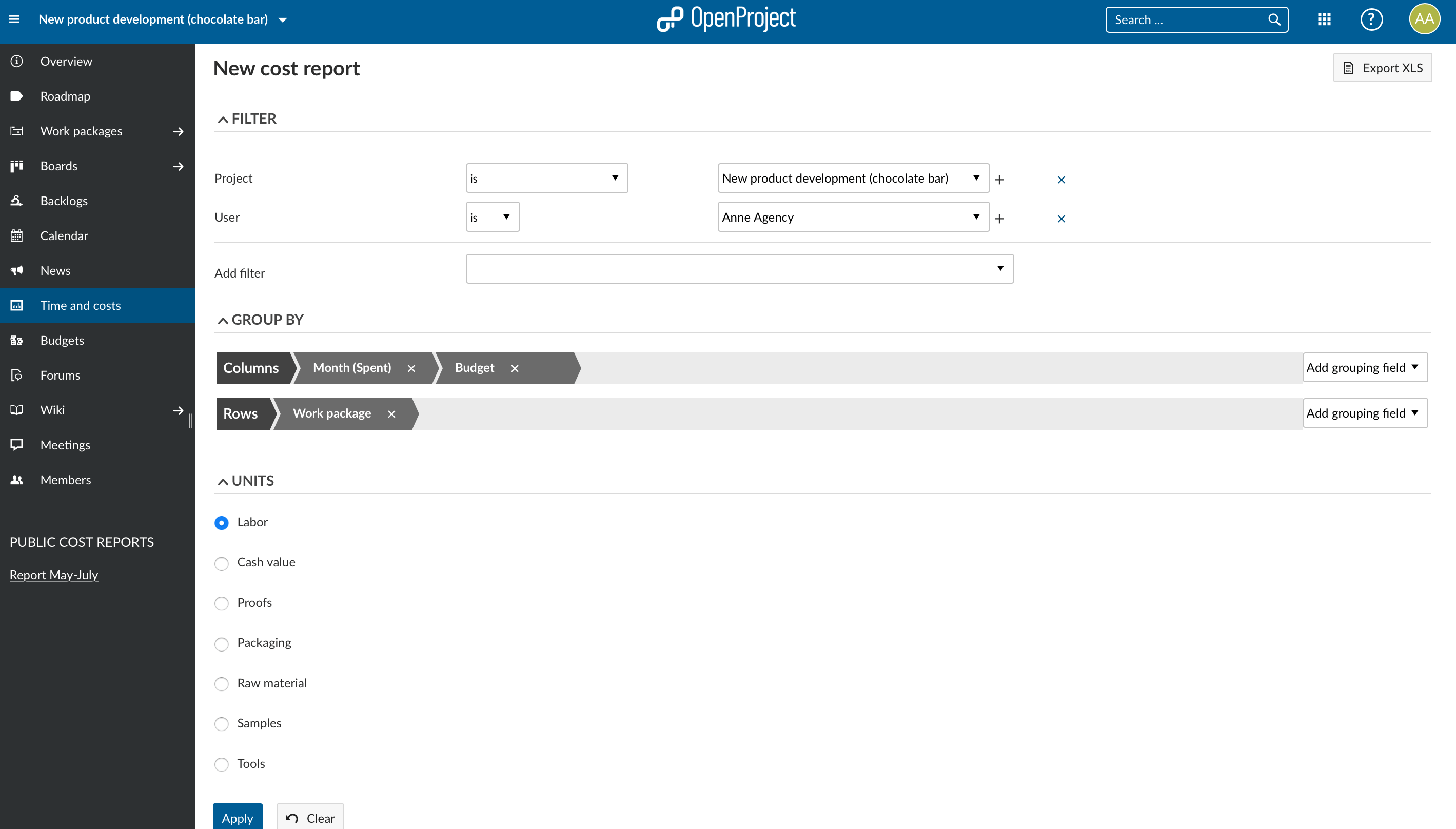 Based on the time and costs booked in OpenProject, the time and cost report module offers you a variety of controlling possibilities. You create your customized reports with plenty of filter options. Saving your customized reports allows you to update them in only one click whenever needed. If you want to run even more complex analysis, you can export your time and cost reports to Excel. The example below shows you a report filtered for the project team member Anne Agency in hours by month and budget.
