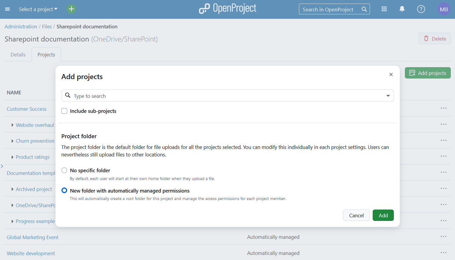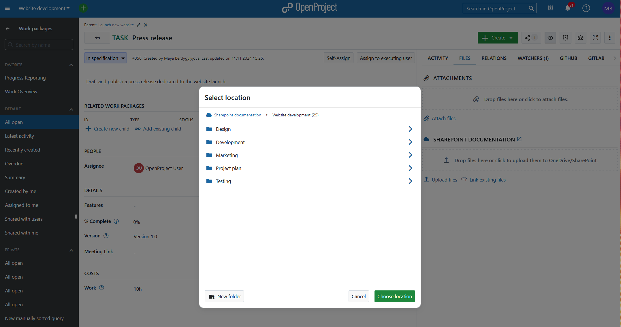 Create and manage OneDrive/SharePoint folders from OpenProject, ensuring seamless organization as your project progresses.