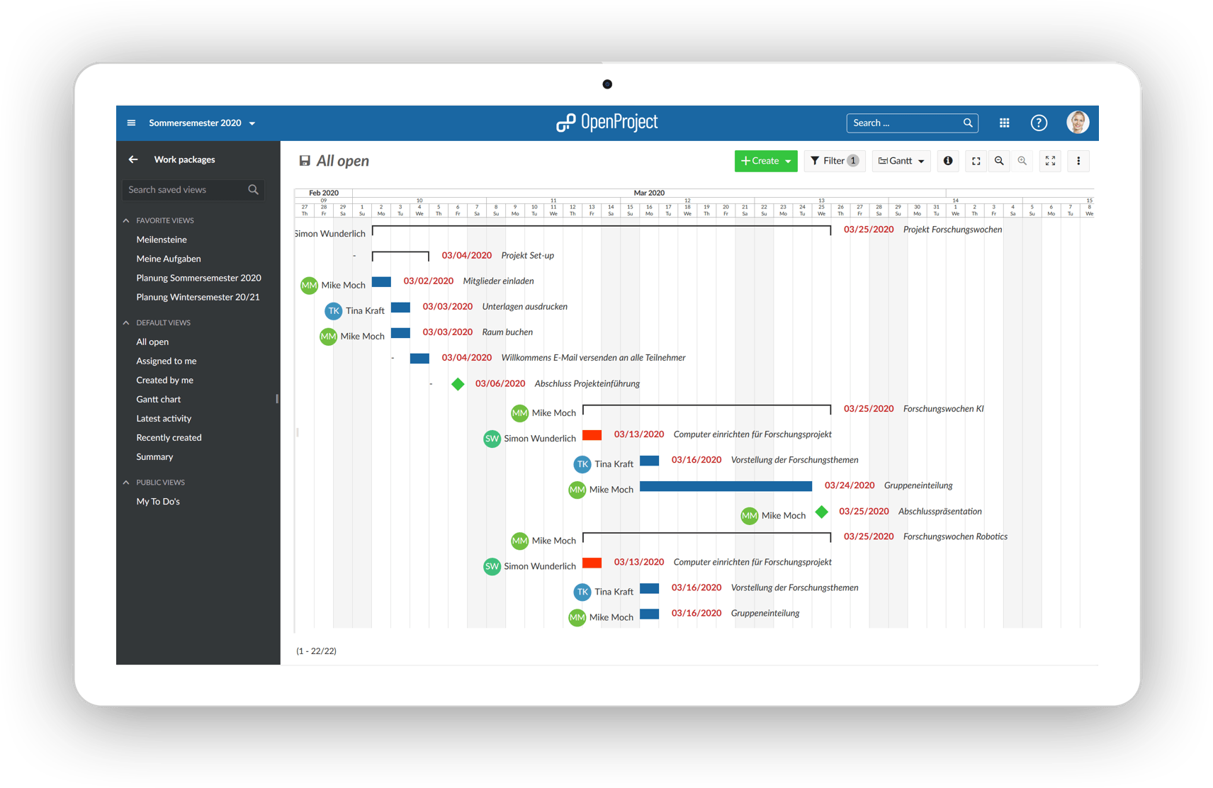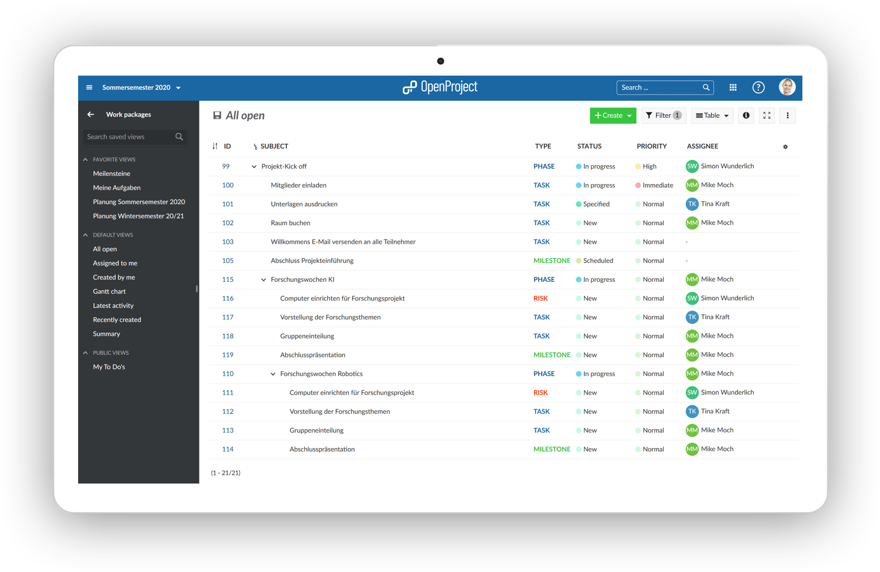 Für die Projekte wird in OpenProject ein Projektstrukturplan erstellt und die Arbeitspakete dann heruntergebrochen, verteilt und bearbeitet.