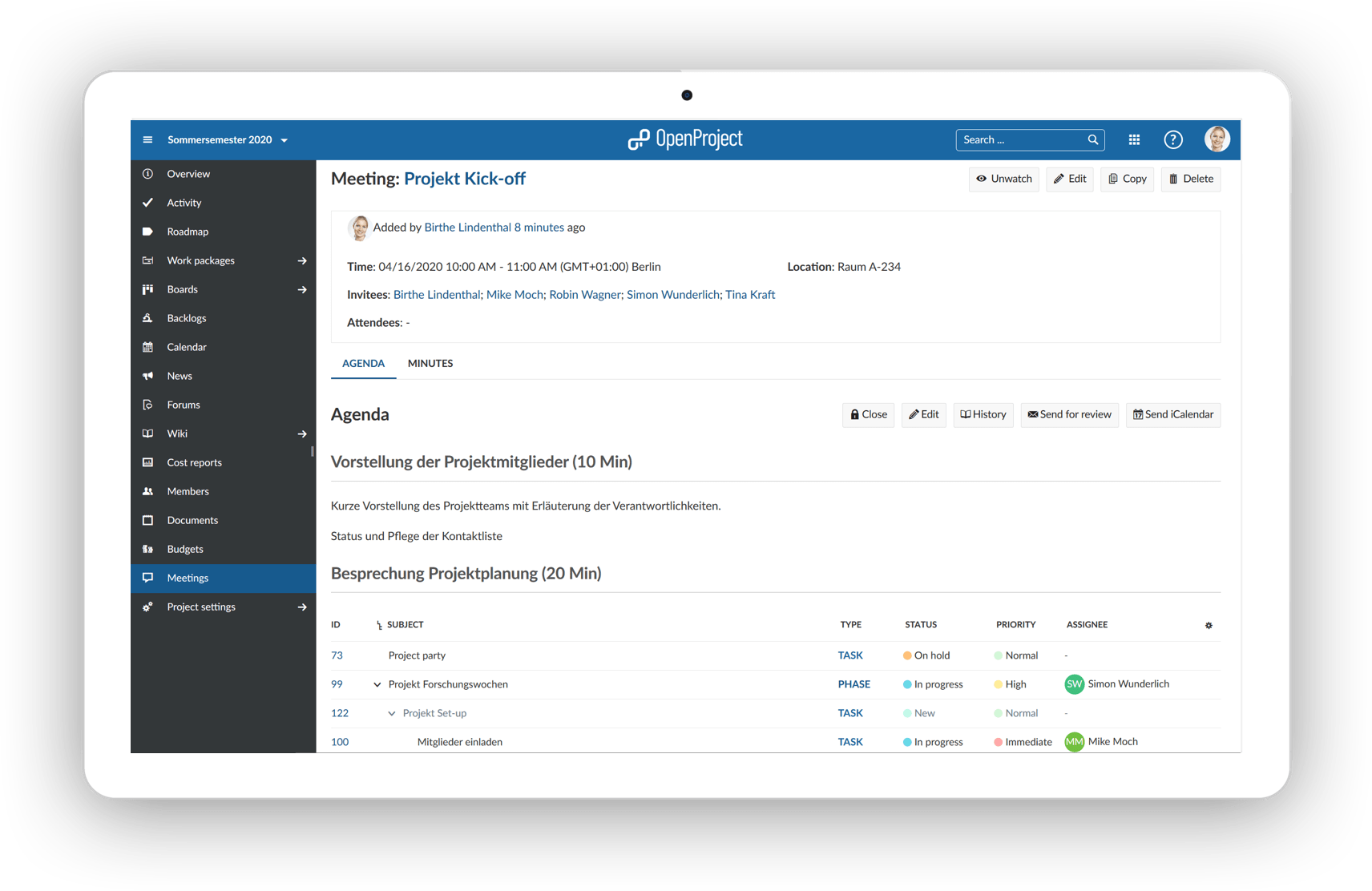 Planen von Meetings durch das gemeinsame Erstellen von Agenden und Teilen der Ergebnisse in Protokollen mit allen Beteiligten ist ein entscheidender Faktor für den Projekterfolg.