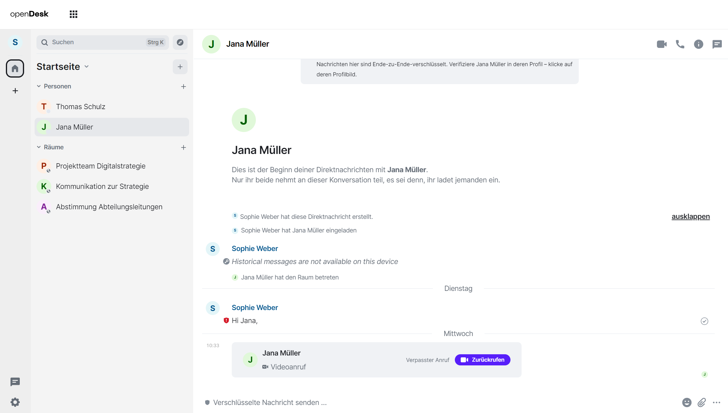 openDesk offers real-time communication via chat, based on sovereign and secure solutions. The chatting features include voice and video calling.