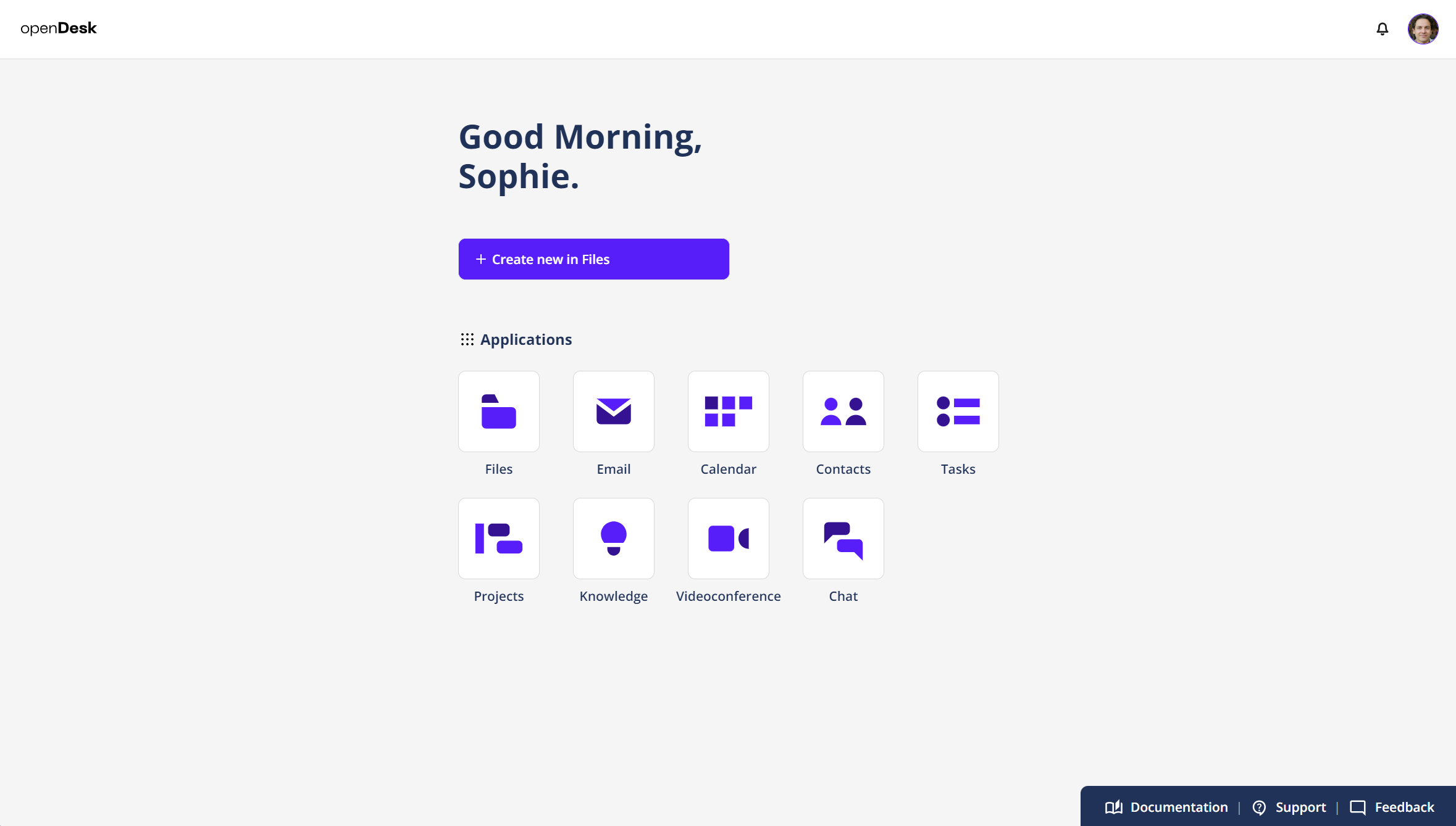 Start your day with openDesk: The portal offers an easy access to all applications. Check your calendar and emails, create new files, and get up to date with your tasks and projects. Or start a chat or video conference with your colleagues. All in one place.