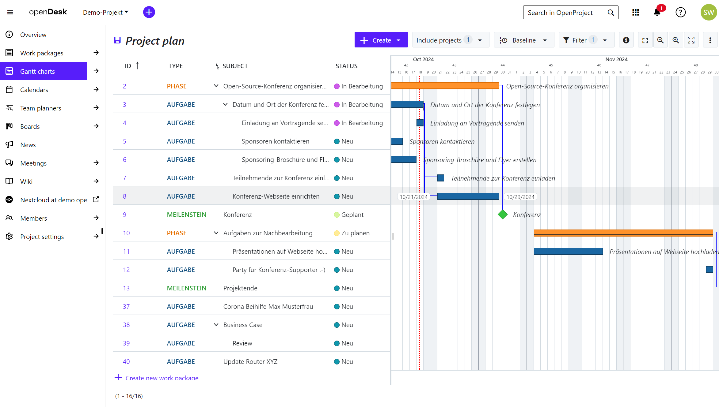 OpenProject brings comprehensive project management features to openDesk, enabling teams to manage their projects efficiently throughout the entire project lifecycle, from planning to execution.
