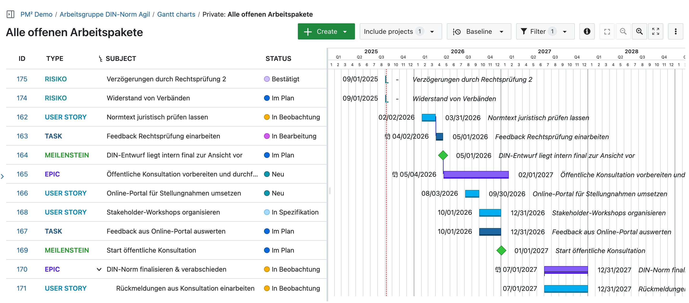 A PMflex-compliant workflow in OpenProject includes all phases from initial idea to project closure. You can define decision gates, assign roles, and use checklists and dashboards for documentation. Gantt charts, milestones, and status reports ensure structured, transparent project execution.