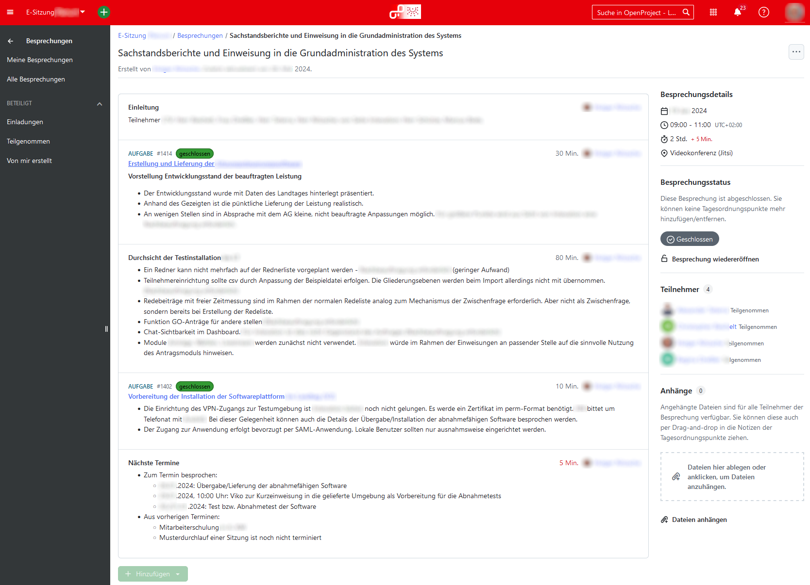 Im Meetings Modul werden Besprechungspunkte geplant, mit Arbeitspaketen verknüpft und die Ergebnisse dokumentiert.