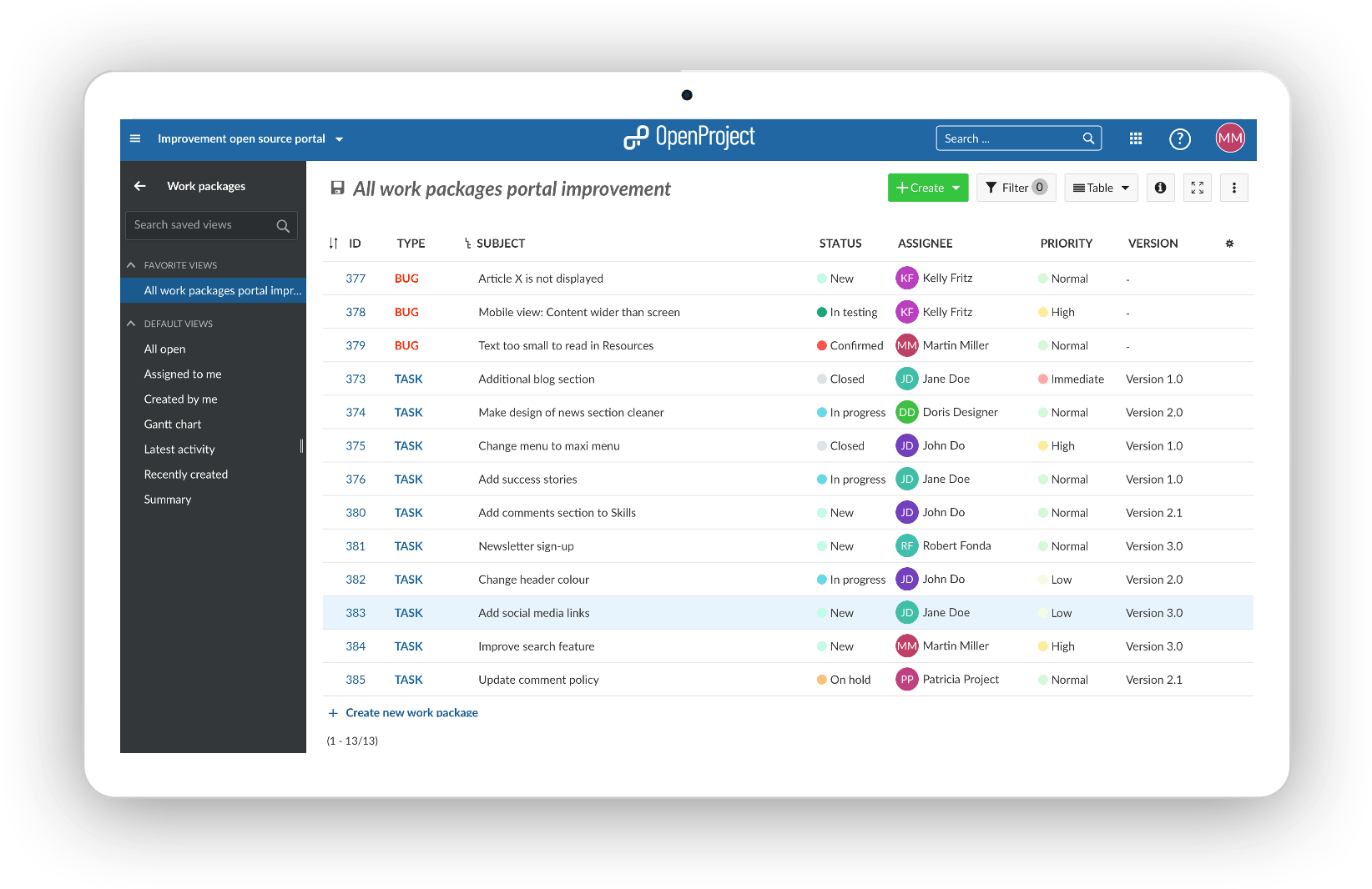 Alle Aufgaben können in OpenProject gesammelt werden, so dass nichts verloren geht. Gehen Sie von den größeren Aufgaben ins Detail und filtern Sie nach Ihren Bedürfnissen.