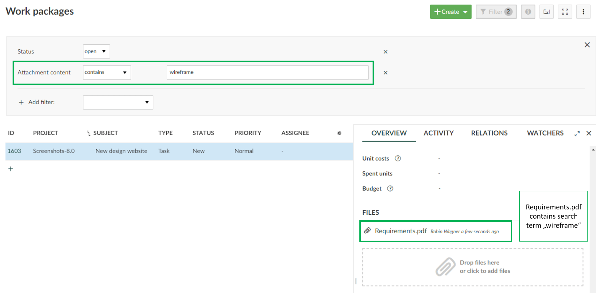 Want to quickly find work package attachments based on their content? This is possible now thanks to the full text search. You can either search by the content of an attachment or by its file name. Simply go to the work package page and apply the attachment filters to see the work packages with those attachments.