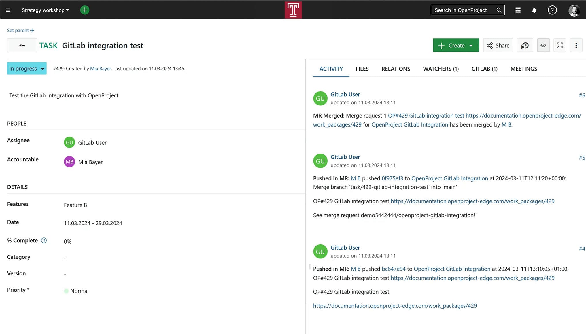 In higher education, IT teams tend to use GitLab over GitHub. In Temple’s bi-weekly meeting that is open to all staff in ITS to discuss OpenProject, they discuss how to use OpenProject and add new items to their wishlist. The new integration with GitLab was high on the list!