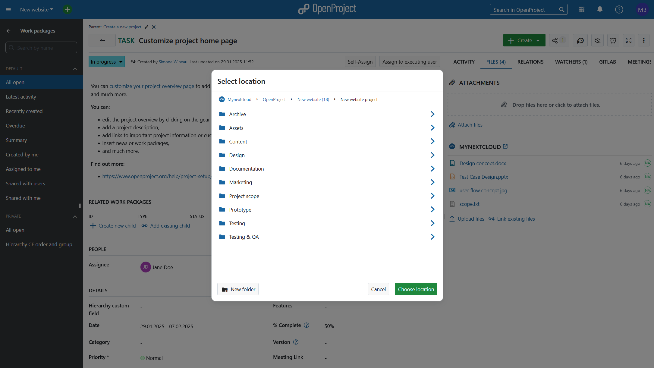 Easily create new folders in Nextcloud directly from OpenProject, so your documents remain structured and adaptable as the project progresses.