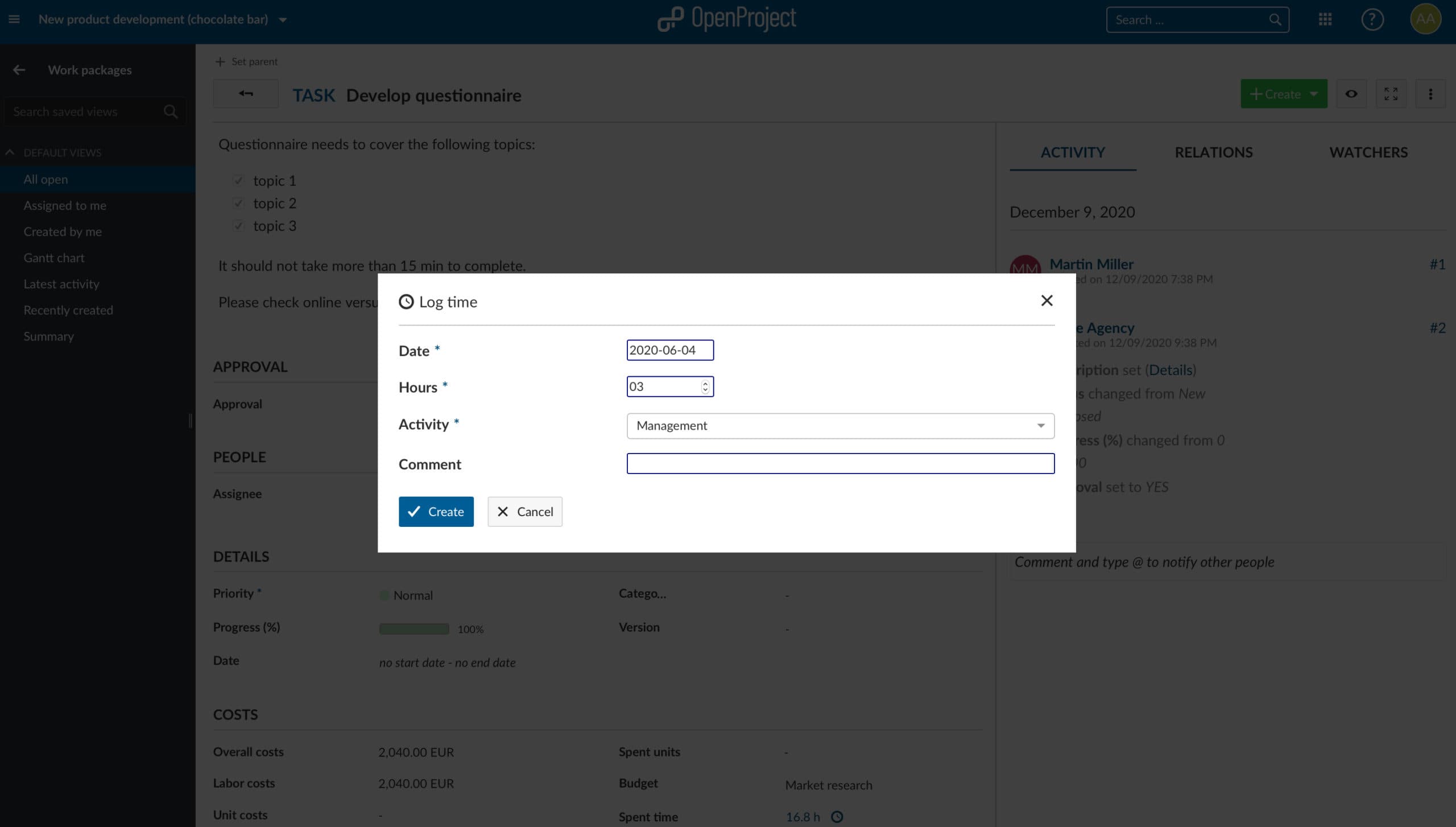 OpenProject claims to record all information. Therefore, project members can log their hours directly in OpenProject. Furthermore, unit costs can also be booked on work packages. Logging time is quick and easy and can be done within the detail view of a work package, on the My page or in the work package table view. A pop-up window opens and all details can be captured in it.