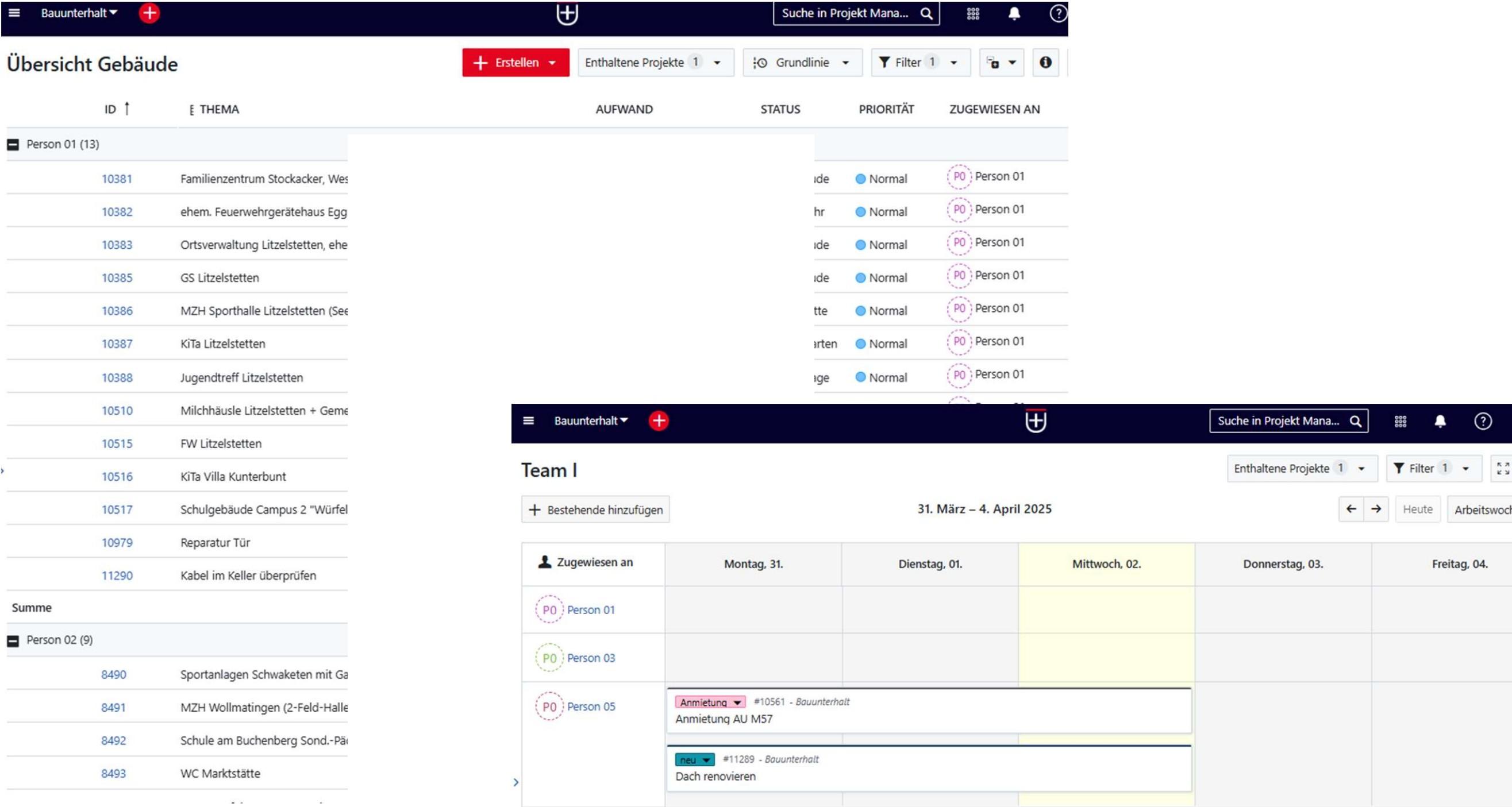 The maintenance and repair of municipal buildings in Constance is now also fully mapped in OpenProject. The 16-people team uses Kanban boards and work breakdown structures to manage the maintenance of more than 160 buildings. Each building is mapped in OpenProject using work package types, subdivided by building category. Each task for these buildings - from repairs to regular inspections - is created directly in the system as an associated subtask and assigned to the responsible team members for processing.